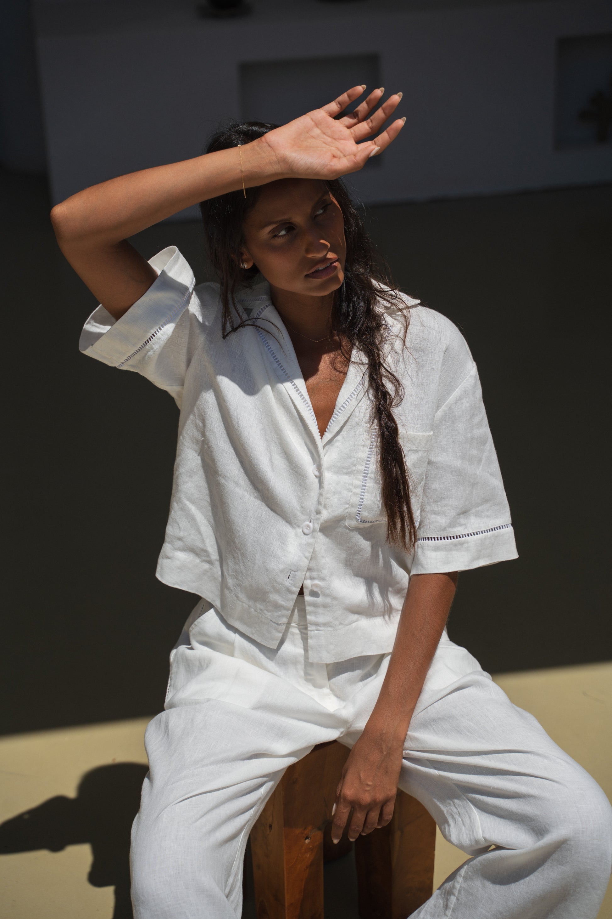 Unleash your playful side with the QUINN linen shirt. Made with 100% EUROPEAN FLAX®, this linen shirt features a relaxed boxy shape and a touch of quirkiness with a cotton lace insert on the front pocket, collar, and sleeve. French seamed throughout.