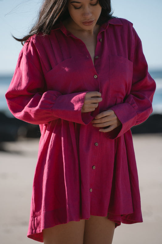 Woman in a LILLY PILLY Polka dot linen dress standing between two columns. Woman in a LILLY PILLY Polka dot linen dress standing between two columns.