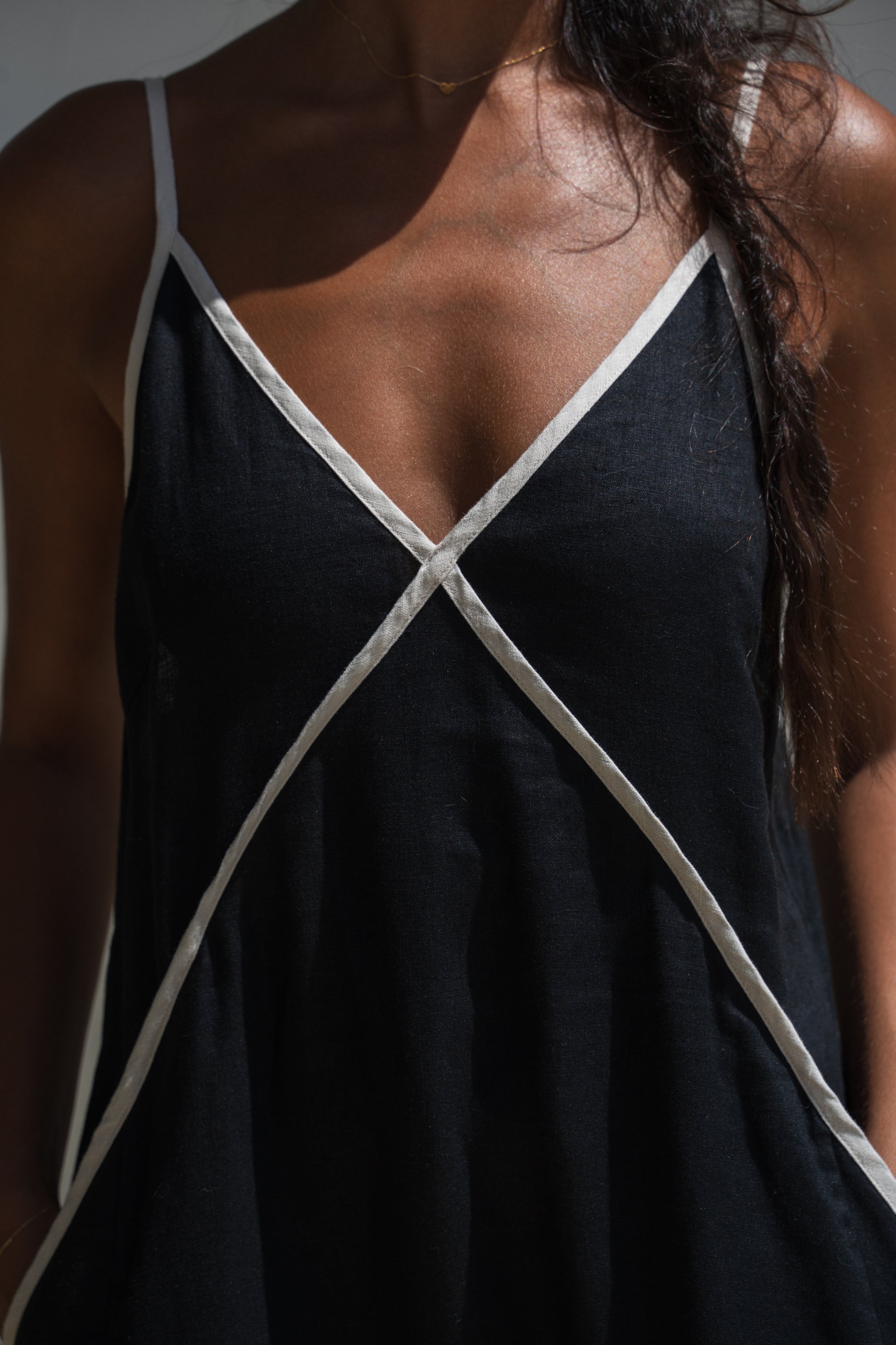 AZALEA - your new go-to flowy maxi linen dress made from 100% EUROPEAN FLAX® certified linen. Featuring a relaxed fit & flattering V neckline, she’s effortlessly chic and comfy all day long. The contrast binding adds a subtle detail, while adjustable shoulder straps make sure the fit is just right. Plus pockets on the front contrast bind. Petite and curvy-bust friendly.